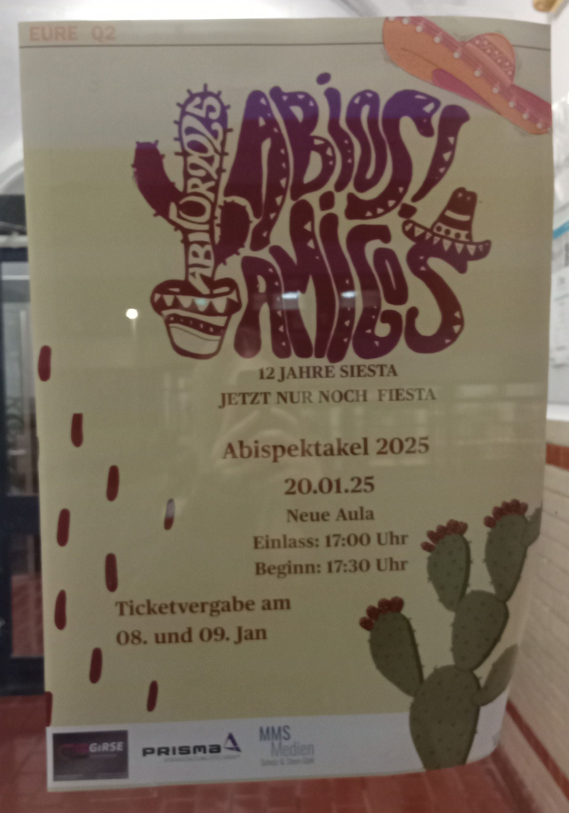 Am 20. Januar 2025 um 18.00 Uhr war es endlich soweit: Das Abispektakel unter dem diesjährigen Abimotto „Abios Amigos" wurde von den beiden Moderatorinnen der Q2 eröffnet. Bereits lange vor Beginn fanden sich zahlreiche Schülerinnen und Schüler, Lehrerinnen und Lehrer und auch Eltern vor dem Eingang der neuen Aula ein und warteten gespannt auf den Einlass. Die Stimmung war super und die Plätze der neuen Aula sehr gut gefüllt. Die coole Lichtershow und das tolle Bühnenbild lassen nur erahnen, wie viel Arbeit sich alle Beteiligten gemacht haben. Nach einer kurzen Begrüßung des Publikums wurden das Team der Schülerinnen und Schüler der Q2 „Die Schulhoflegenden" sowie das Team von Lehrerinnen und Lehrer des Abijahrgangs „Coolos 4os" unter lautem Applaus auf die Bühne gebeten.