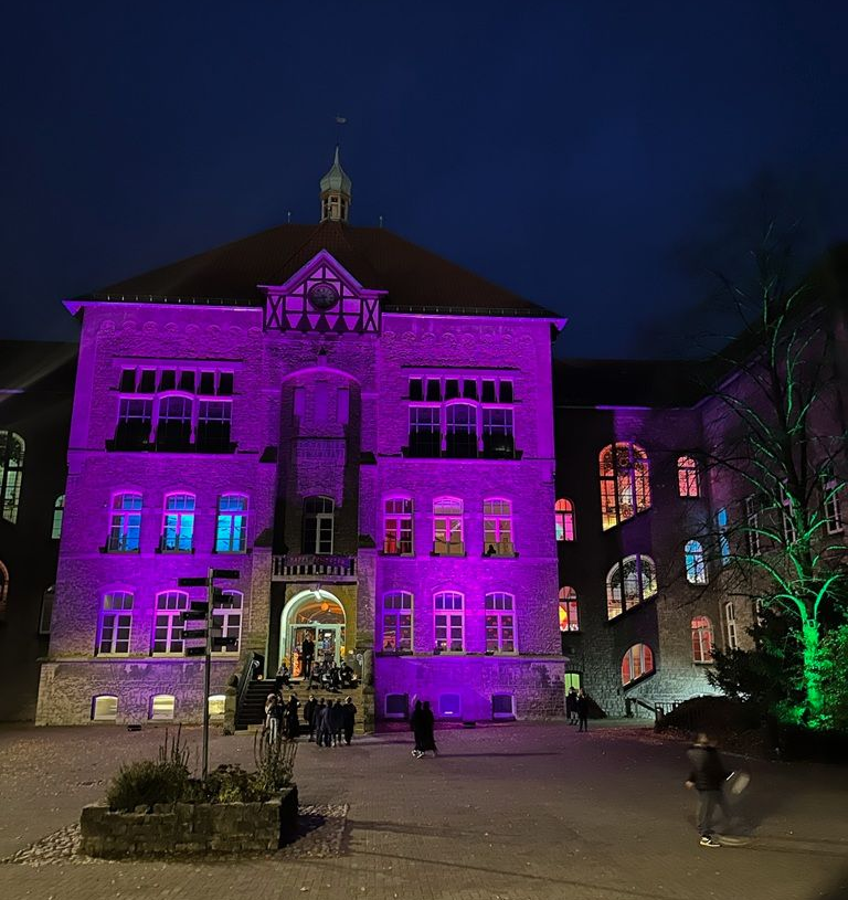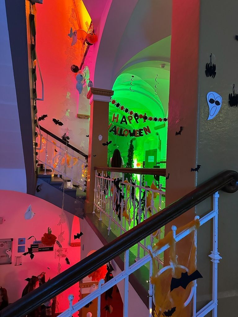 Wo sonst Unterricht stattfindet, herrschte diesmal gespenstische Stimmung: Der Altbau war liebevoll und aufwendig dekoriert, sodass man an jeder Ecke neue gruselige Details entdecken konnte. In verschiedenen Räumen wurden zahlreiche Aktionen angeboten – vom Basteln und Rätseln über Film- und Spielangebote bis hin zu einem echten Gruselraum. Außerdem konnte man sich gemeinsam fotografieren oder passend zum Abend schminken lassen. Besonders beliebt war die Disco im Klausurraum, die mit beeindruckender Lichttechnik und guter Musik für ausgelassene Stimmung sorgte. Ein weiteres Highlight war die Geschichte rund um den Schulgeist Leopold, der geheimnisvoll durch das Gebäude spukte. Beim Kostümwettbewerb wurden schließlich die kreativsten Verkleidungen ausgezeichnet. Unterstützt wurde die SV von vielen Lehrkräften, Eltern, der Schulverwaltung, dem Technikteam und der Schulleitung. Dank des großen Engagements und der tollen Zusammenarbeit wurde die Halloween-Nacht zu einem vollen Erfolg. Eines steht fest: Dieser Abend hat eindrucksvoll gezeigt, wie gemeinschaftlich, kreativ und fröhlich das Miteinander am Leopoldinum ist.