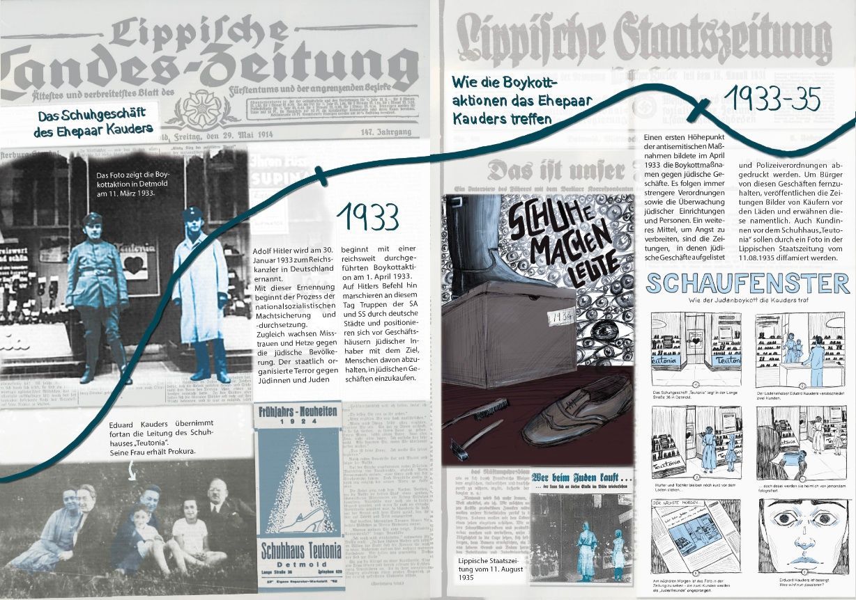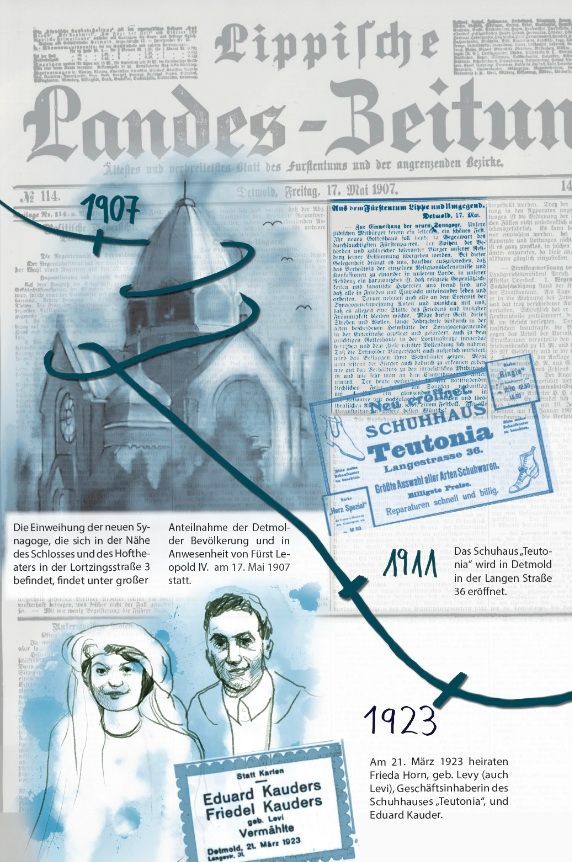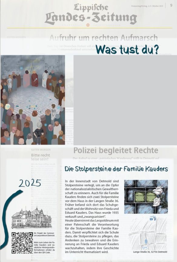 Seit Mai 2025 hat das Leopoldinum die Patenschaft für die Stolpersteine für Frieda und Eduard Kauders übernommen. Auf dieser Seite finden Sie das Begleitmaterial zu einer von Schüler*innen konzipierten Kunstausstellung zum Schicksal des in Auschwitz ermordeten Ehepaars. Mithilfe der Detmolder Illustratorin Francis Kaiser haben die Projektmitglieder sechs künstlerische Plakate geschaffen, die dauerhaft in unserer Schule zu sehen sind und für den Unterricht genutzt werden.