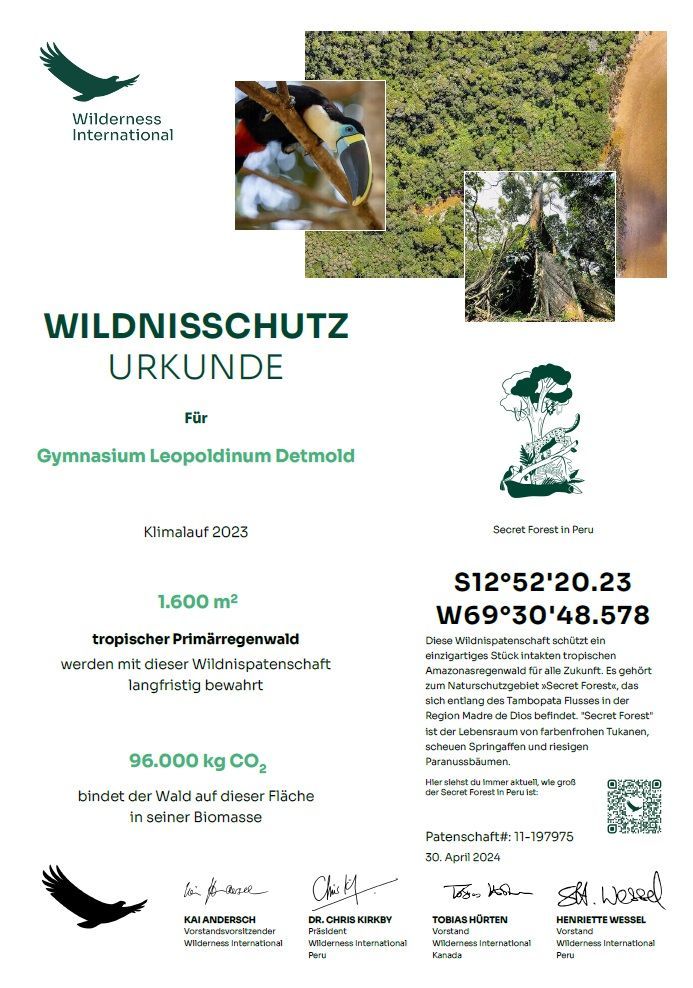 Vor einem Jahr sind zahlreiche Leopoldiner:innen bei Sonnenschein unermüdlich Runden zum Schutz und Erhalt der Regenwälder gelaufen. Dabei ist eine unglaubliche Spendensumme zusammengekommen und wir konnten die Organisation Wilderness International mit 1600€ beim Erhalt und Schutz der Regenwälder unterstützen! Das entspricht 1600m2 Regenwald, die 96.000 kg CO2 in Biomasse binden.