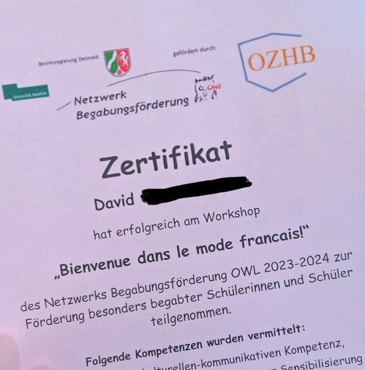 Zusammen mit 11 weiteren Schülerinnen und Schülern aus den Jahrgängen acht bis zehn hat David in Minden einen Workshop besucht, in welchem die Gruppe das Land Frankreich näher kennen lernen durfte.