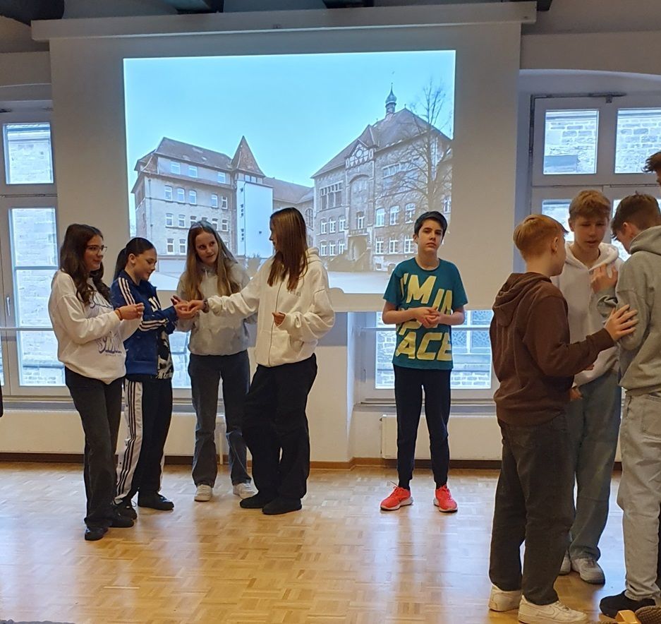 So beginnt die Inszenierung „Herzlichst wir vier“, die Schülerinnen und Schüler einer achten Klasse des Leopoldinums in Detmold mit der Theaterpädagogin Bettina Frank erarbeitet haben. Sie haben sich eine Woche lang mit dem Leben von Fritz Herzberg beschäftigt, der während der Zeit des Nationalsozialismus Schüler am Leopoldinum war. Herzberg war als Kind jüdischer Eltern in Detmold geboren und aufgewachsen.