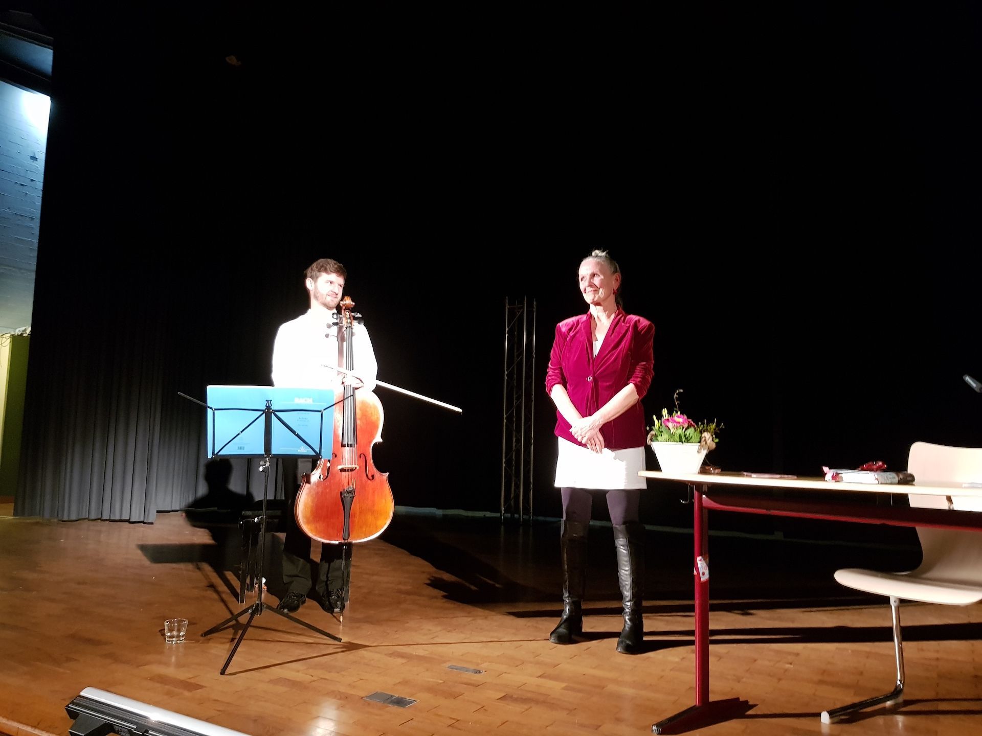 In Kooperation mit dem Stadtgymnasium Detmold fand am Freitag, 9. Februar, in der Neuen Aula des Leopoldinum eine Lesung mit Cellospiel zum Roman „ALMA“ von Dagmar Fohl statt. Der Roman schildert die berührende Geschichte der jüdischen Musikerfamilie Stern während des Nationalsozialismus. Die Sprecherin und Tänzerin Ulrike von der Linden (Detmold) trug einzelne Passagen aus dem Roman vor, die von Mario Simic (Berlin) durch Cellostücke von Tschaikowsky und Debussy untermalt wurden.