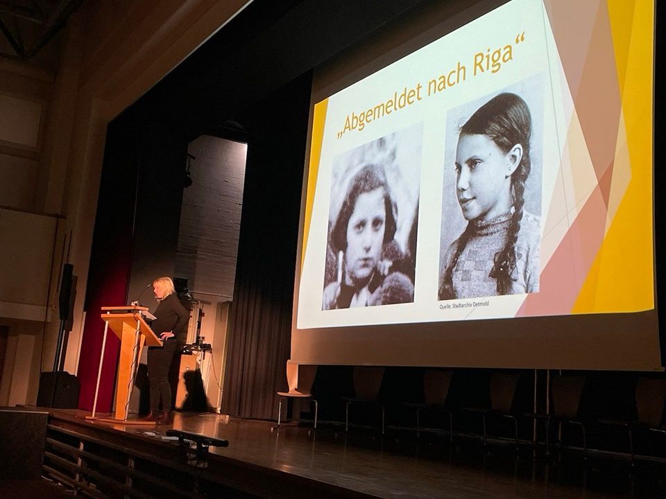 Am Dienstag, 30. Januar 2024, fand in der Neuen Aula des Leopoldinum nach dem zentralen Gedenktag am 27. Januar die Veranstaltung „Die Deportation der Detmolder Juden nach Riga“ statt. Dabei handelte es sich um eine Kooperation des Grabbe-Gymnasiums mit dem benachbarten Leopoldinum.
