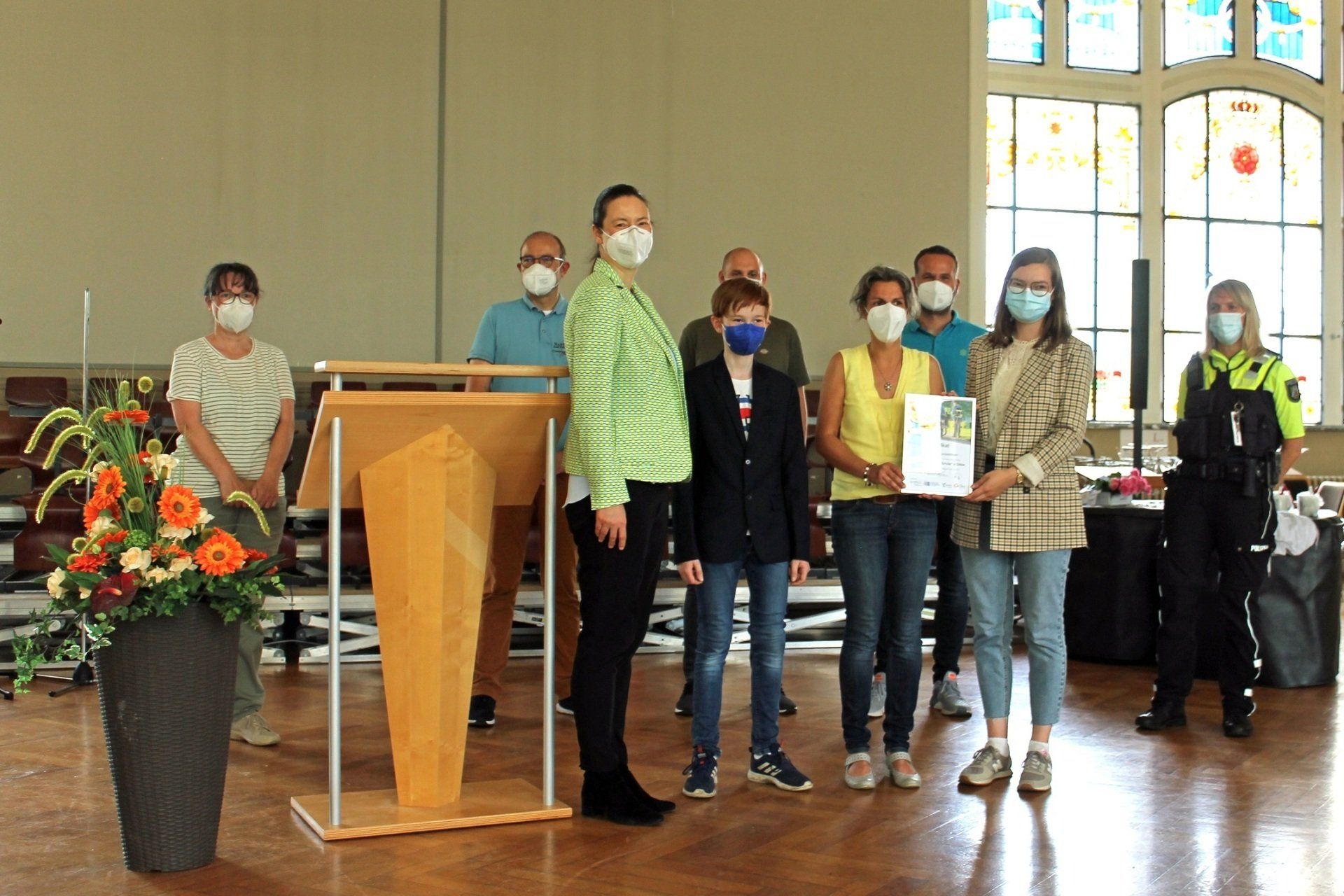 Vor einigen Monaten stellte sich Sechstklässler Moritz Nohren vom Leopoldinum die Frage, wie man Schülerinnen und Schüler und Lehrerinnen und Lehrer dazu motivieren kann, sich mehr für den Klimaschutz zu engagieren, insbesondere für den Schulweg öfter das Fahrrad zu nutzen. Die Lehrerinnen Alexandra Wiemann und Marie-Noelle Eickhoff haben das Anliegen aufgegriffen und mit dem Kreis, der Kreispolizeibehörde und der Stadt Detmold Partner für die Umsetzung gefunden. Das Projekt „Fahrradfreundliche Schule“ war geboren. Für den Einsatz hat die Schule nun ein Zertifikat vom KlimaPakt des Kreises verliehen bekommen. „Das Leopoldinum ist Modellschule und Vorreiter im Kreis hinsichtlich des Radverkehrs. Der Anstoß eines Schülers hat ein Projekt zum Rollen gebracht, von dem auch andere Schulen profitieren können und sollten. Die Effekte sind vielfältig: Umweltschutz, selbstständigere Schüler und ein Bewusstsein für mehr Sicherheit im Radverkehr“, erklärt Tobias Priß vom KlimaPakt.